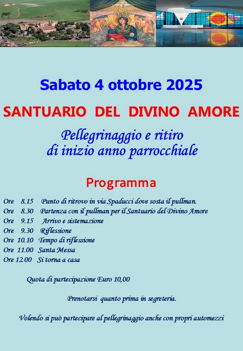 La mattina del 4 ottobre faremo un pellegrinaggio e ritiro al Divino Amore, vogliamo iniziare il nostro anno pastorale nella preghiera e nell'affidamento a Maria. Per iscriversi rivolgersi alla segreteria. C'è un pulmann disponibile, se qualcuno vuole venire con i propri mezzi può unirsi all'orario prefissato.
